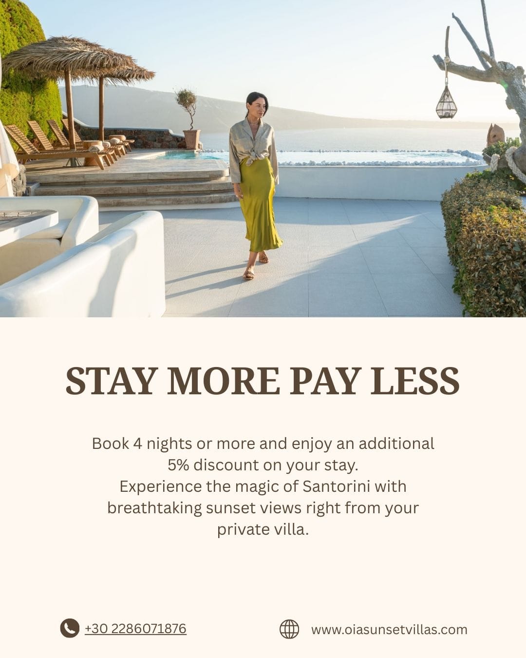"Oia Sunset Villas" invites guests to feel the tranquility and serenity of the island in the brilliantly appointed villas while relaxing in the harmony of the spa and its inspiring surroundings.
